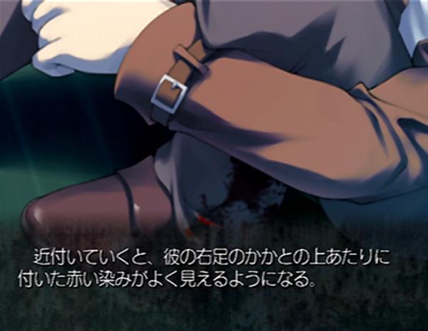手塚は総一の声にも振り返らず、総一に背中を向けたまま軽く手を振った。 ―――見張りを続けてくれているみたいだけど………。 近付いていくと、彼の右足のかかとの上あたりに付いた赤い染みがよく見えるようになる。 赤い染みは直径が5センチ程。 染みの外縁部は完全に乾燥して赤茶けてきているが、中心付近はまだ乾いていないのか僅かに光沢がある部分があった。 ―――どうやら血なのは間違いないみたいだけど………。 このCGでは手塚の右足の先までは描かれていません。 けどこの画面を見る限り、ナレーションが言いたいのは画面に映っている足の血痕だと思います。 どう見ても『右足のかかと』じゃなくて『左足のかかと』だよね? |